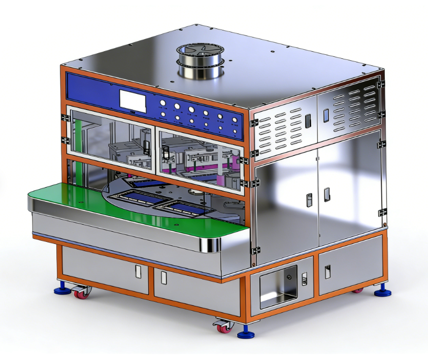 | GRS-EFQB-200-3A 设备用途: 本机适用于软包装锂电池(方形,圆柱)最终真空封装及切除气袋边。手动放置电芯在转盘上料机构上,电池冲坑方向向下,通过转盘旋转送料,(转盘放3个工位 |