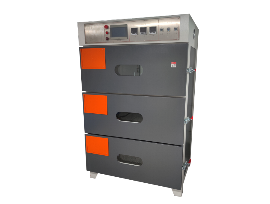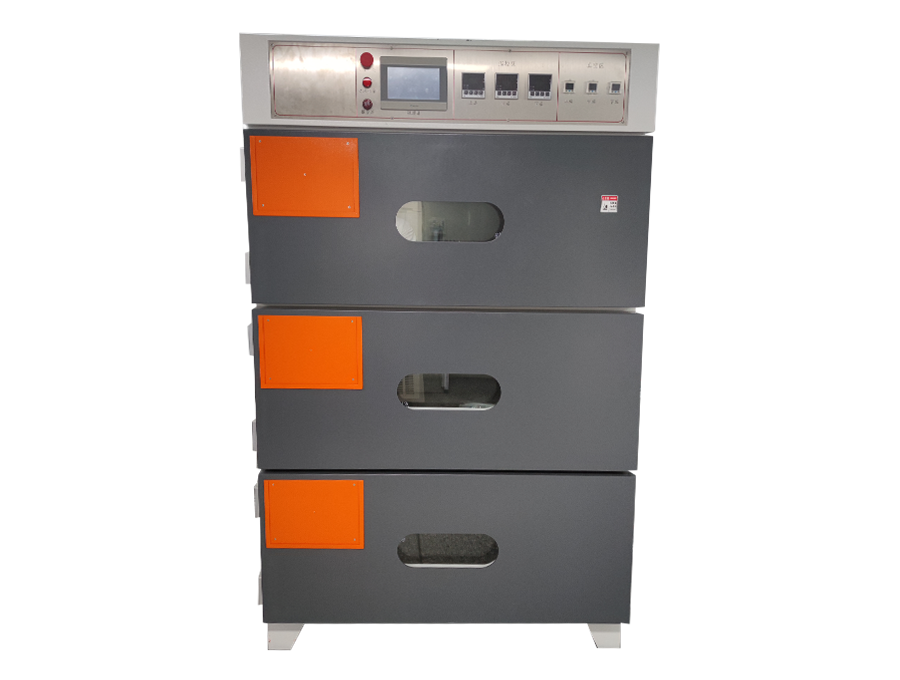 每台机可连续循环工作;基本流程:开门将电芯或极片放入烤箱中,再设定加热时间、 真空时间、氮气时间系统将根据已设定的时间参数自动完成加热和定时换气,完成烘烤过程。